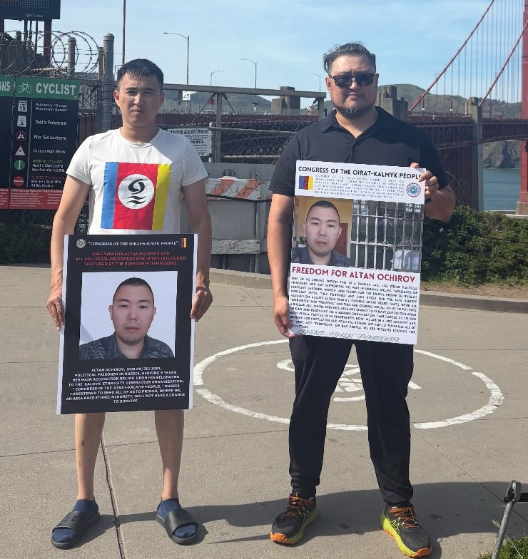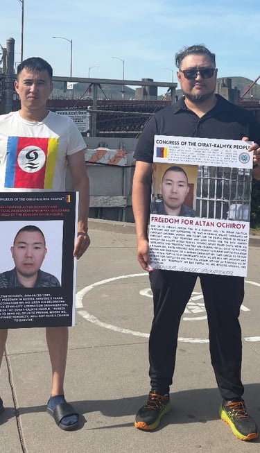 Two prominent members, Chingis Gariaev and Arslan Kitaev, participating in a protest in San Francisco, aim to draw international attention to a Kalmyk prisoner of conscience, Altan Ochirov, who is currently being held and tortured in a Russian prison due to his affiliation with the Kalmyk Resistance, known as the Congress of the Oirat-Kalmyk People.